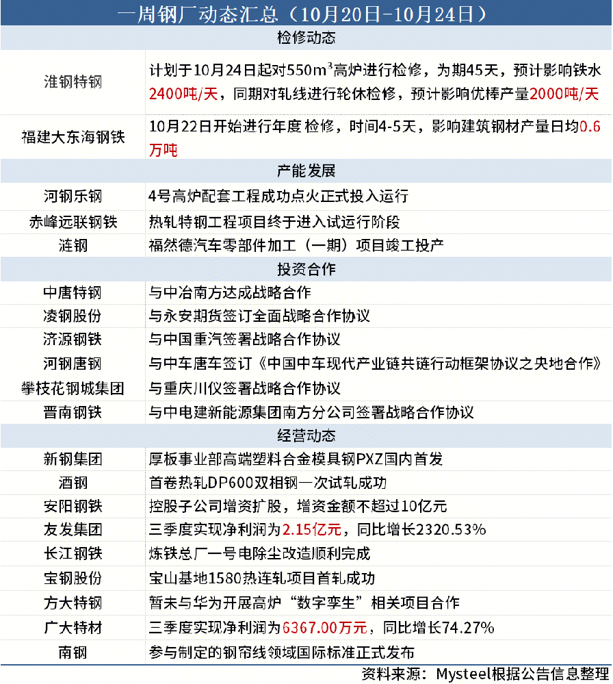 一周钢厂动态汇总(10月20日-10月24日)