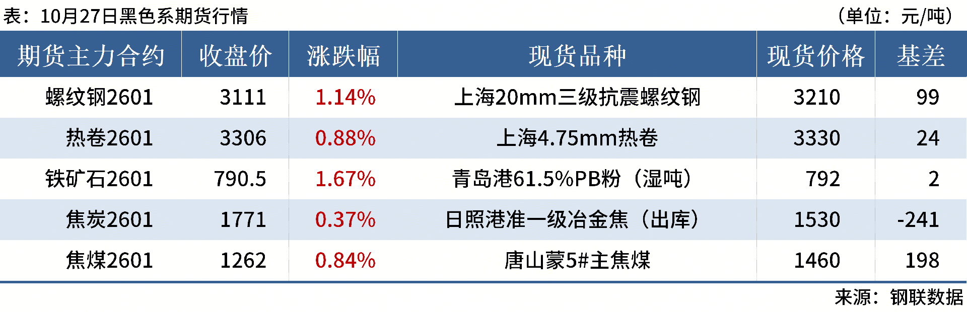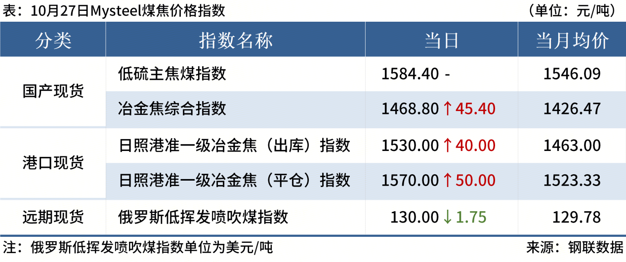 ◎ 焦炭第二轮提涨全面落地,山东、河北主流钢厂发函对焦炭采购价上调,湿熄涨幅50元/吨,干熄涨幅55元/吨,10月27日0时起执行。