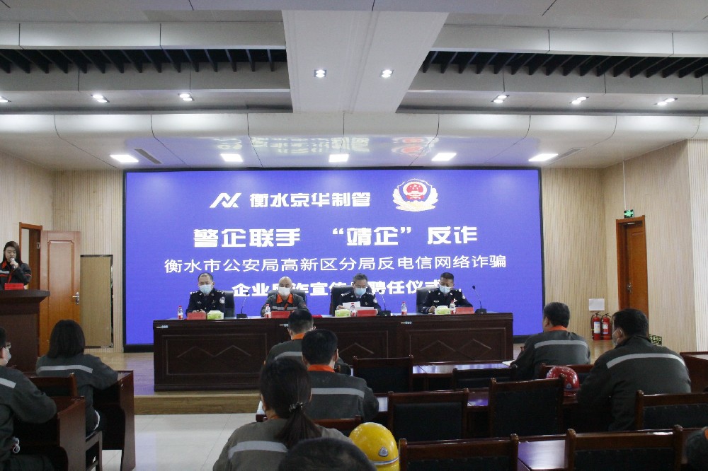 警企联手 “靖企”反诈— 衡水京华召开企业反诈宣传员聘任仪式4月28日,衡水市公安局高新区分局党委委员、副局长张骥等一行4人莅临公司宣传反诈知识,在公司办公楼五楼召开了以“警企联手,‘靖企’反诈”为主题的企业反诈宣传员聘任仪式。公司常务副总赵志强,生产副总刘国勇,总经理助理马亮同公司员工代表参与会议。会议上衡水市公安局···