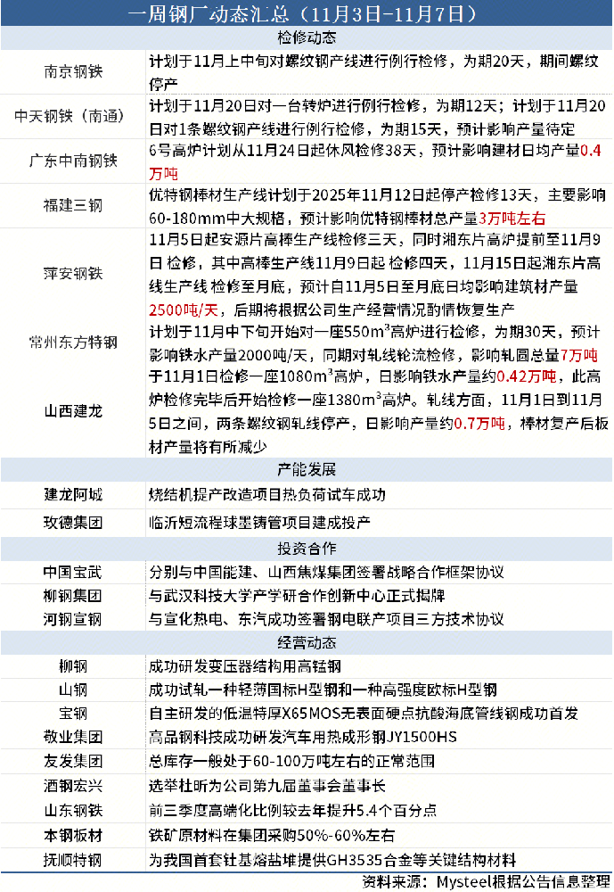 不完全统计,本周(11月3日-11月7日)7家钢厂发布检修信息,具体如下: