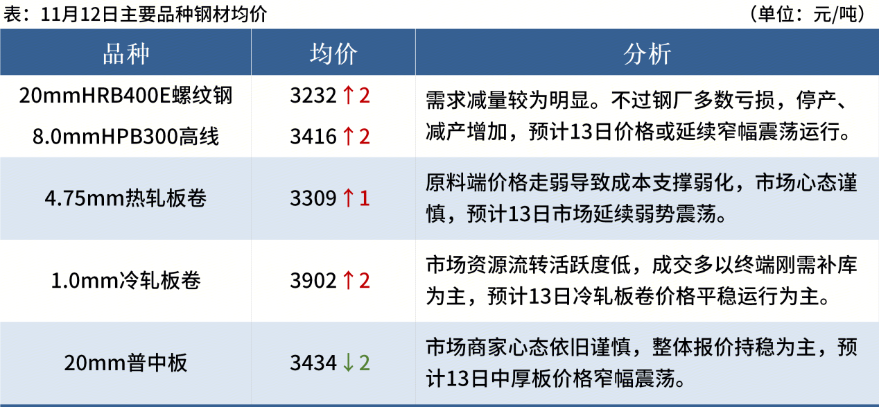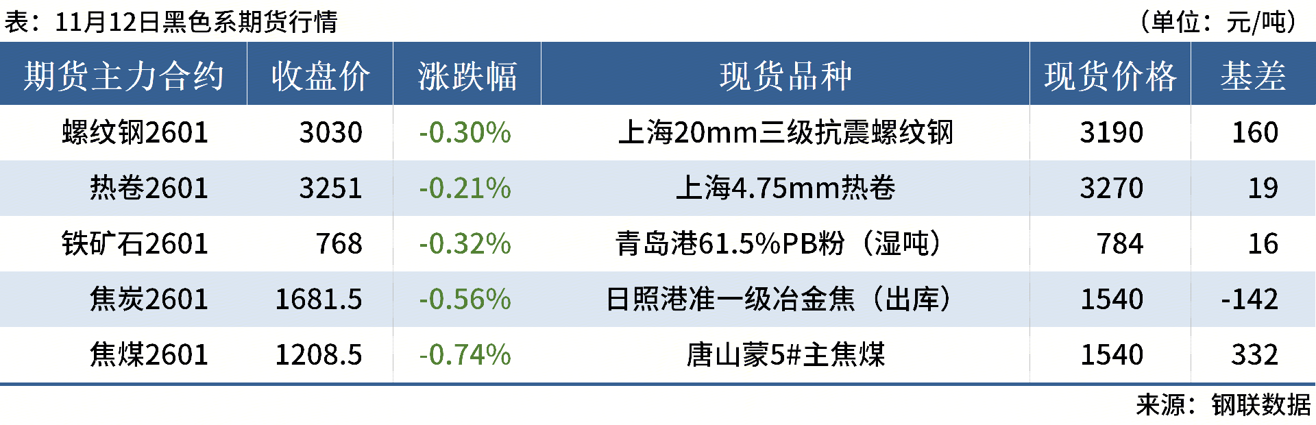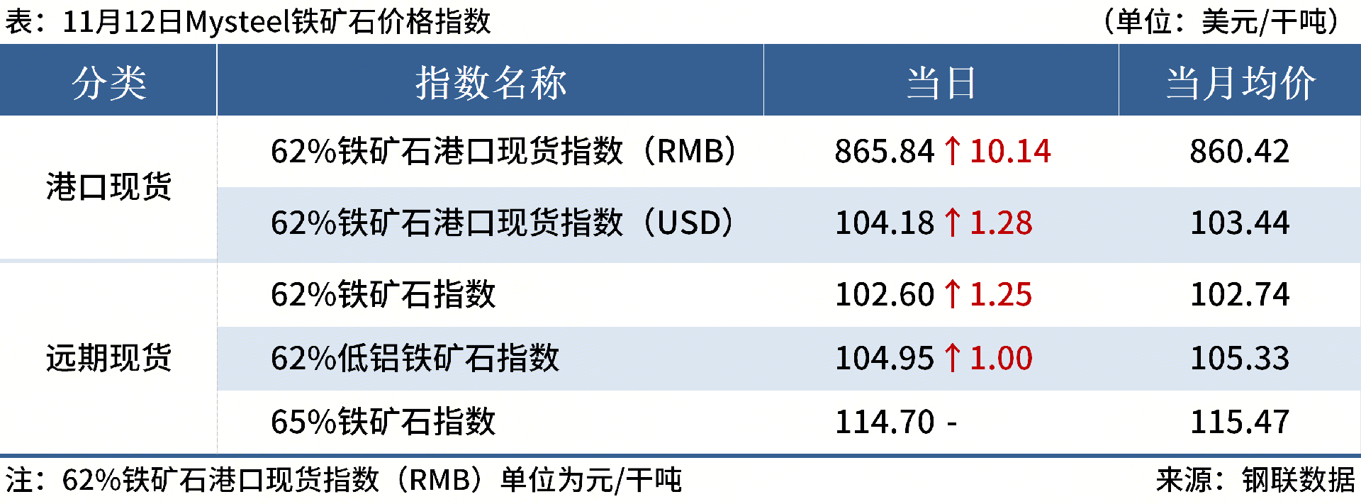 ◎ 11月12日,全国主港铁矿石成交98.80万吨,环比减8.3%;237家主流贸易商建筑钢材成交9.16万吨,环比增0.6%。