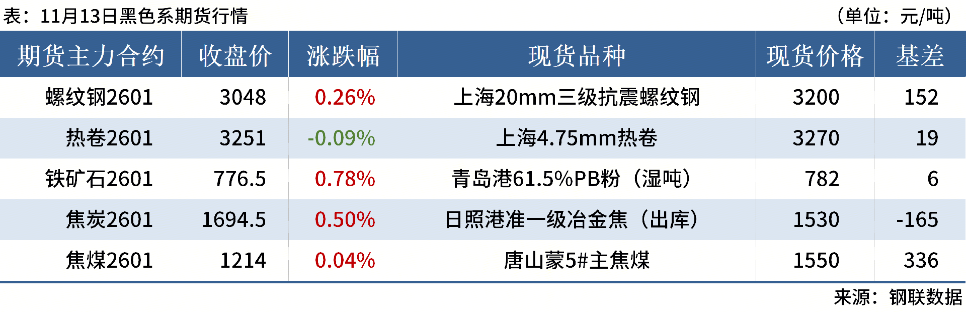 ◎ 11月13日,全国主港铁矿石成交105.00万吨,环比增6.3%;237家主流贸易商建筑钢材成交10.62万吨,环比增16%。