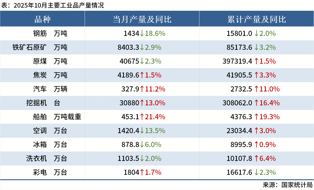 ◎国家统计局最新数据显示,2025年10月份,中国钢筋产量为1434.0万吨,同比下降18.6%;1-10月累计产量为15801.0万吨,同比下降2.0%。其他主要工业品情况如下: