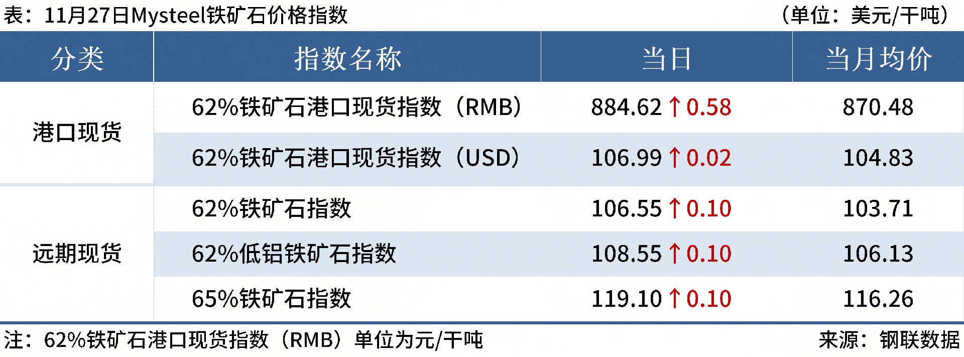 ◎ 11月27日,全国主港铁矿石成交119.10万吨,环比增15.3%;237家主流贸易商建筑钢材成交9.27万吨,环比减0.6%。