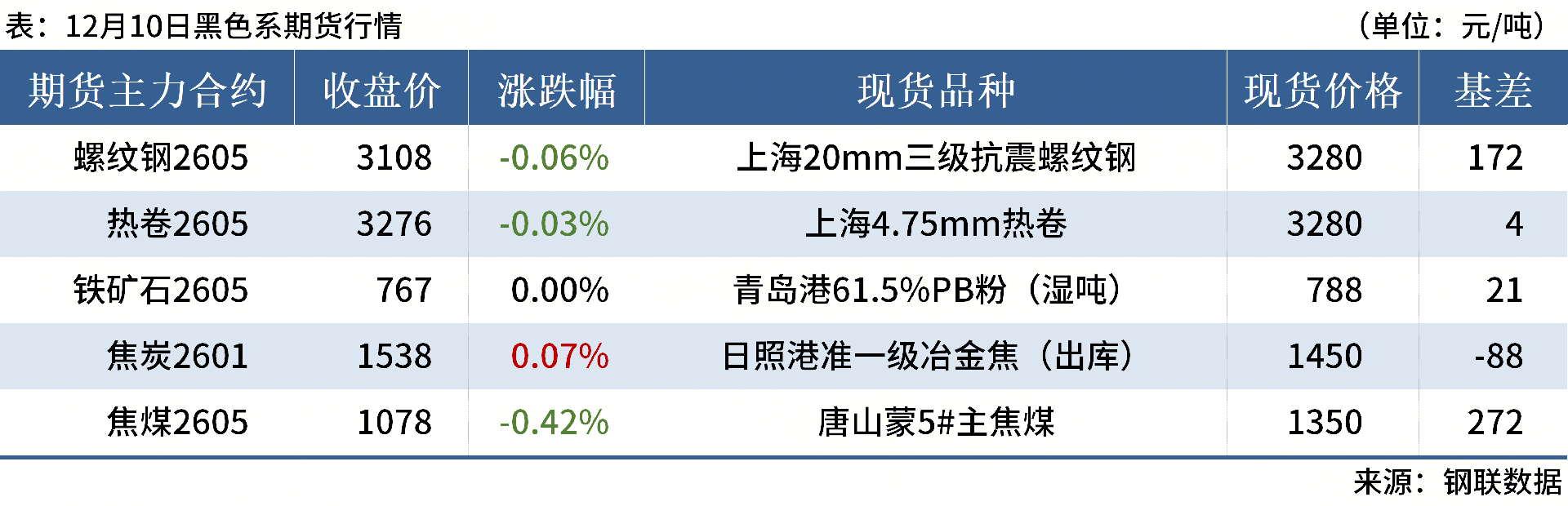 ◎ 12月10日,全国主港铁矿石成交71.50万吨,环比减37.1%;237家主流贸易商建筑钢材成交11.43万吨,环比增23.5%。