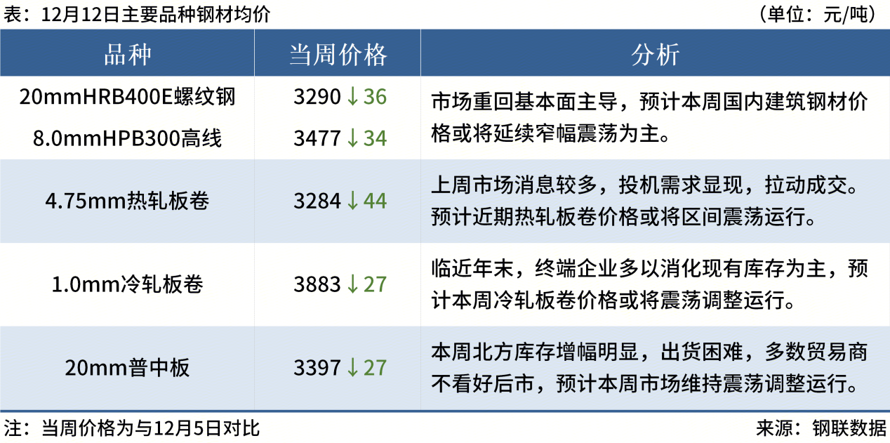 ◎ 12月8日-12月12日,全国螺纹钢均价为3289元/吨,周环比下跌1.11%。供应端,螺纹钢周产量178.78万吨,库存479.5万吨;需求端,消费量203.09万吨,建材周度成交量49.11万吨。