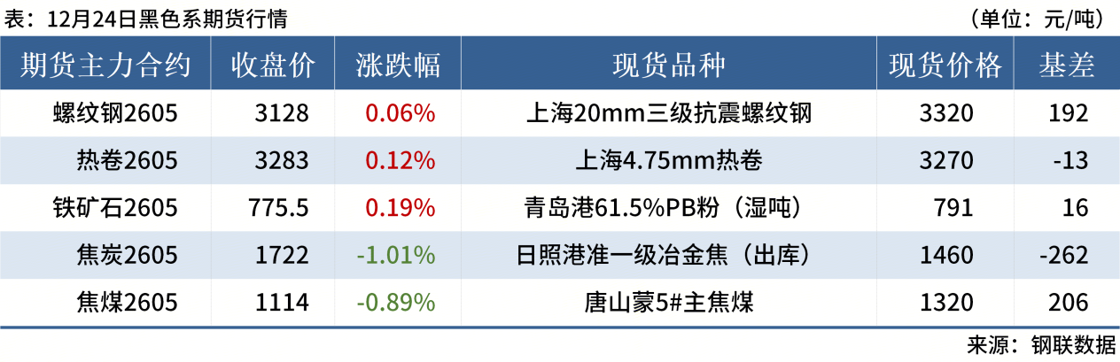 ◎ 12月24日,全国主港铁矿石成交128.80万吨,环比增8.5%;237家主流贸易商建筑钢材成交9.59万吨,环比增7.9%。