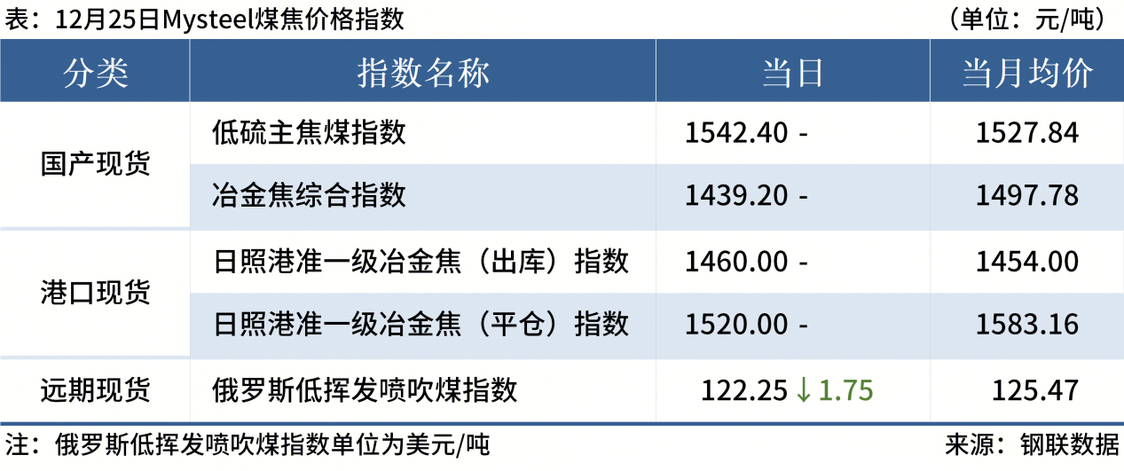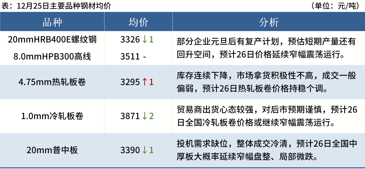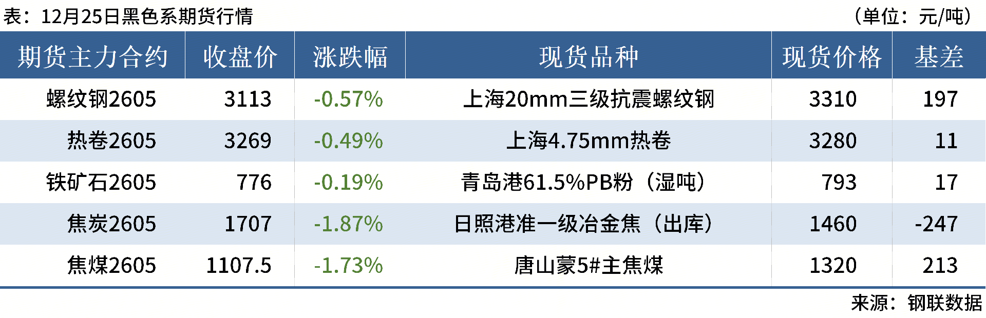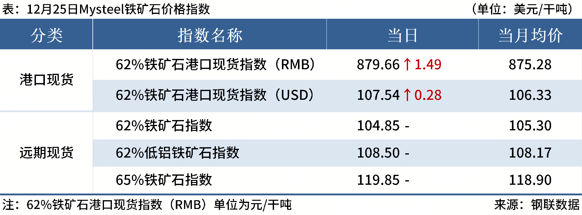 ◎ 12月25日,全国主港铁矿石成交134.10万吨,环比增4.1%;237家主流贸易商建筑钢材成交8.25万吨,环比减13.9%。