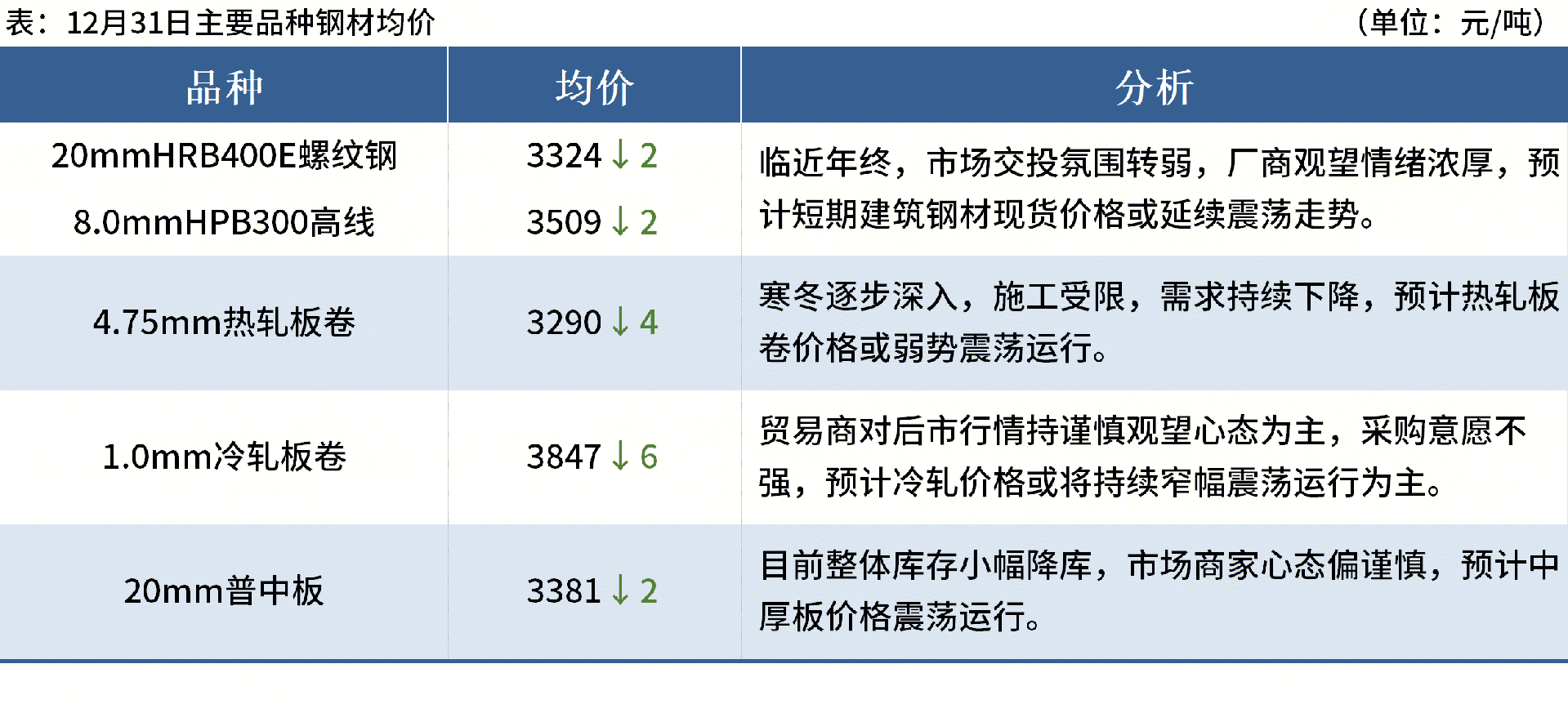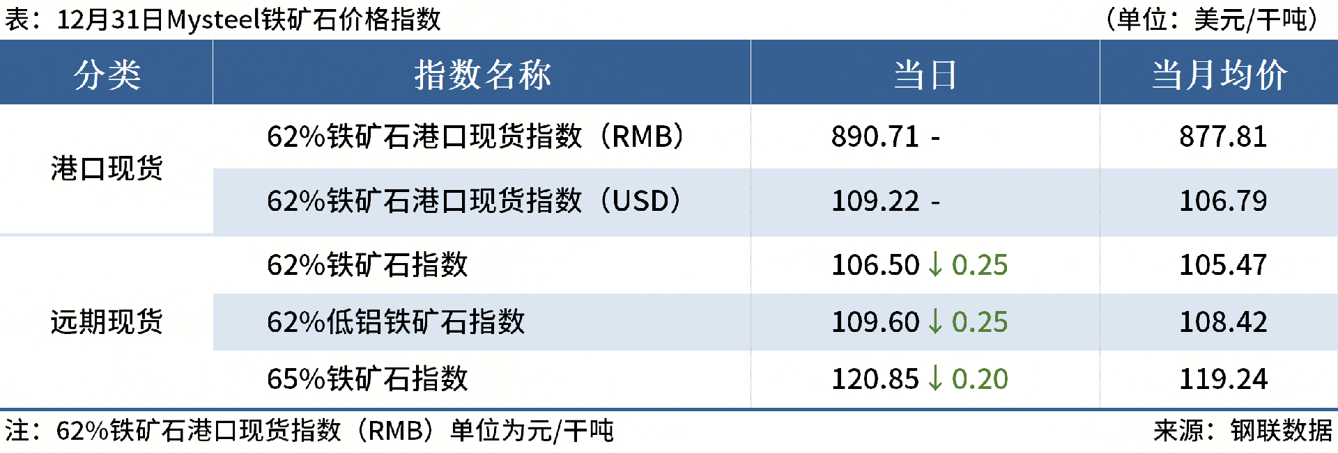 ◎2025年12月31日,全国主港铁矿石成交61.80万吨,环比减55.4%;237家主流贸易商建筑钢材成交8.28万吨,环比减11.2%。