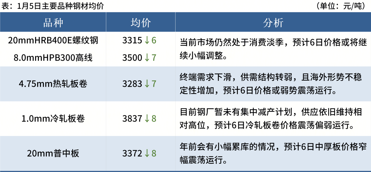 ◎ 1月5日,全国主港铁矿石成交101.17万吨,环比增121.9%;237家主流贸易商建筑钢材成交8.68万吨,环比减4.6%。