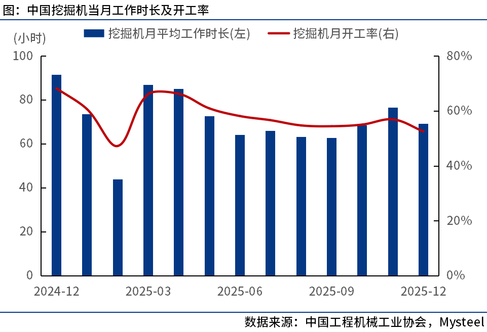 12月,我国工程机械主要产品月平均工作时长为76.5小时,同比下降18.6%,环比下降9.19%。其中:挖掘机69.3小时。