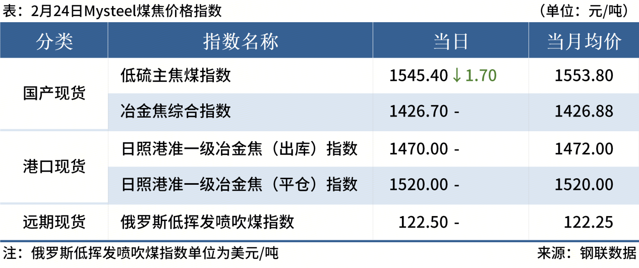 ◎ 本周,全国230家独立焦企样本产能利用率为71.86%,较节前(2月13日)减0.11%;焦炭日均产量50.28万吨,减0.09万吨;焦炭库存55.52万吨,增11.77万吨。