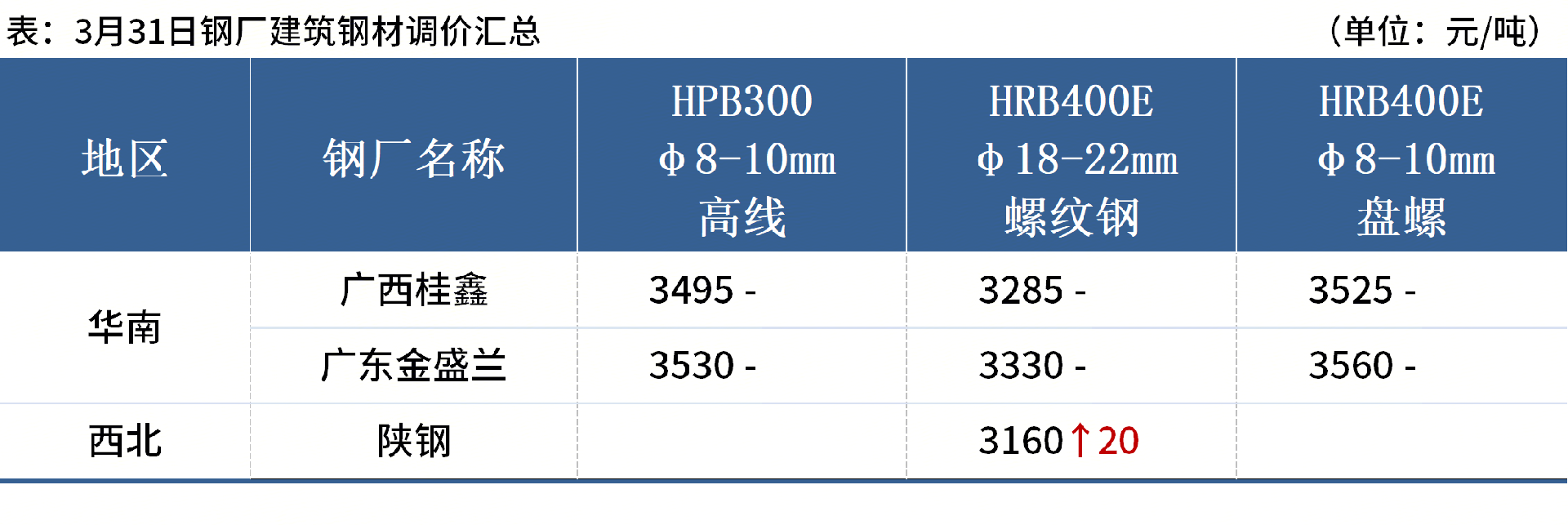 ◎3月31日,中天钢铁出台4月上旬价格,螺纹钢平,线材盘螺平。华东螺纹钢3400元/吨,线材盘螺3700元/吨。