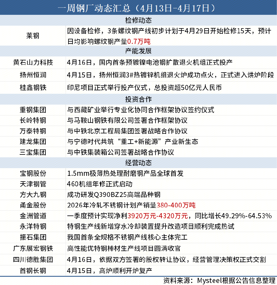 一周钢厂动态汇总(4月13日-4月17日)