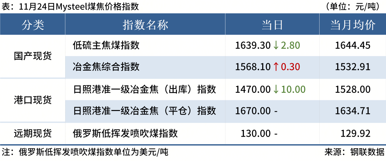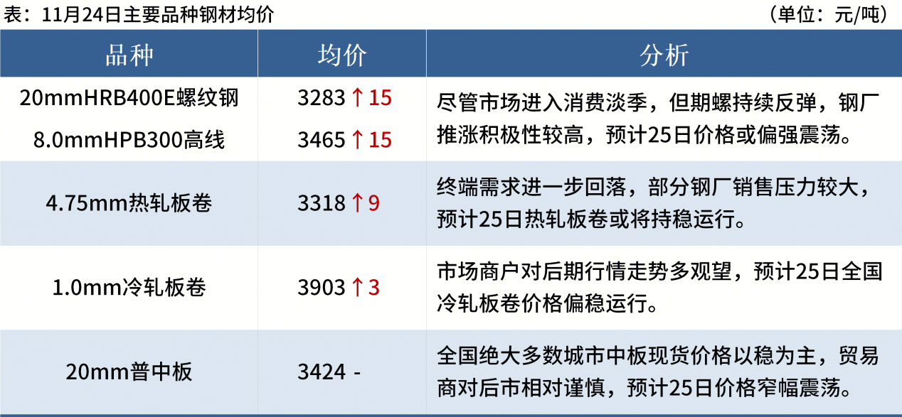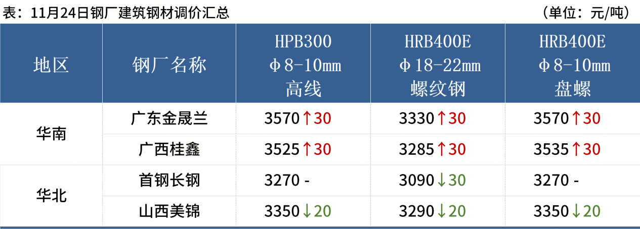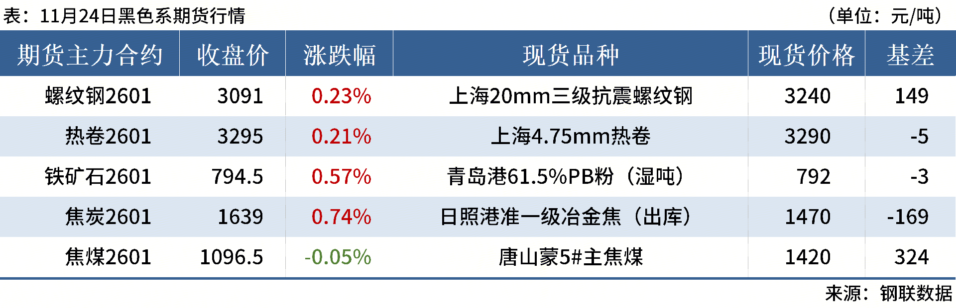 ◎ 11月24日,全国主港铁矿石成交112.10万吨,环比增22.4%;237家主流贸易商建筑钢材成交13.11万吨,环比增37.9%。