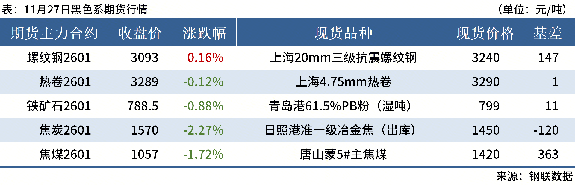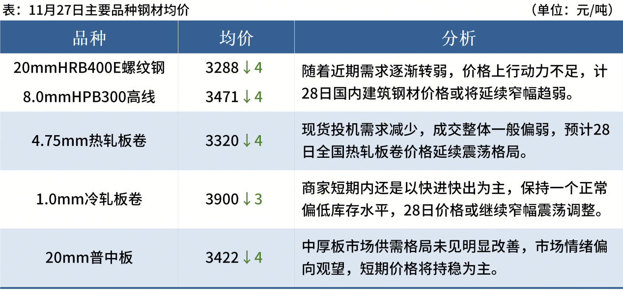 ◎ 11月27日,全国主港铁矿石成交119.10万吨,环比增15.3%;237家主流贸易商建筑钢材成交9.27万吨,环比减0.6%。