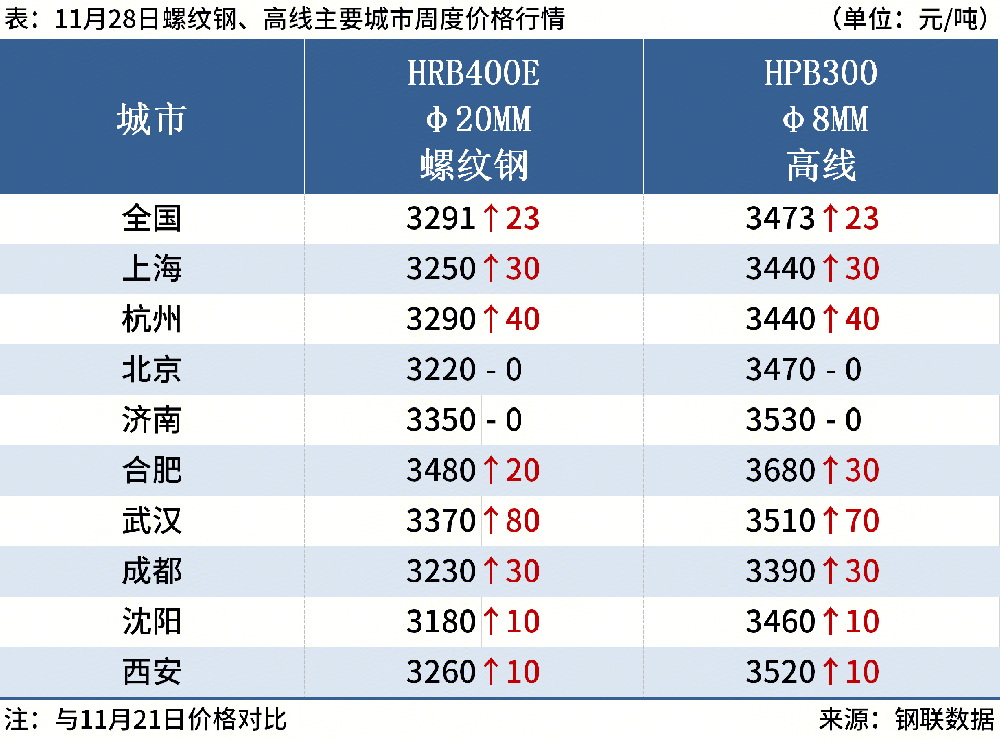 截至11月28日,全国主要城市20mm三级抗震螺纹钢均价3291元/吨,周环比上涨23元/吨;8.0mmHPB300高线均价3473元/吨,周环比上涨23元/吨。