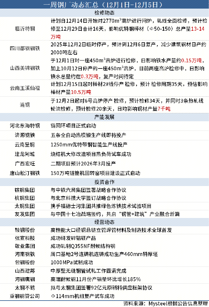不完全统计,本周(12月1日-12月5日)5家钢厂发布检修信息,具体如下:
