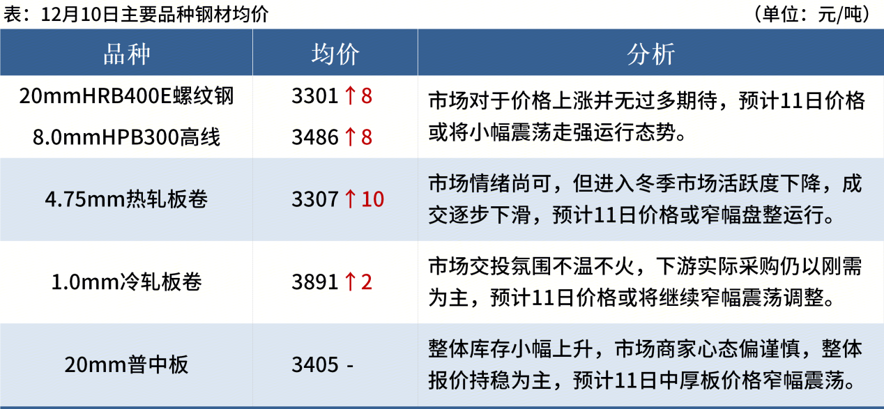 ◎ 12月10日,中天钢铁出台12月中旬价格,螺纹钢、线材、盘螺均上调50元/吨。华东螺纹钢3400元/吨、线材盘螺3600元/吨。