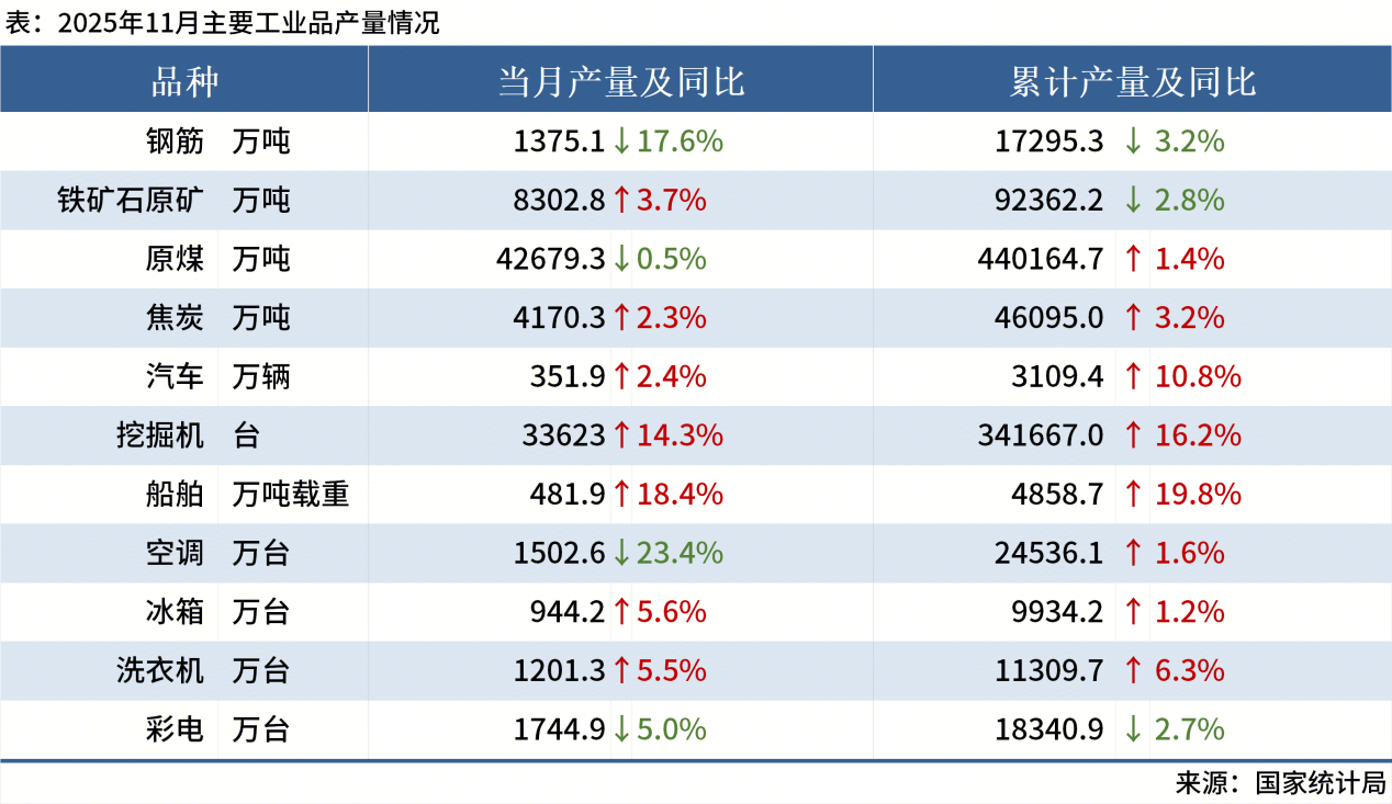 ◎国家统计局数据显示,2025年11月份,中国钢筋产量为1375.1万吨,同比下降17.6%;1-11月累计产量为17295.3万吨,同比下降3.2%。其他主要工业品产量如下: