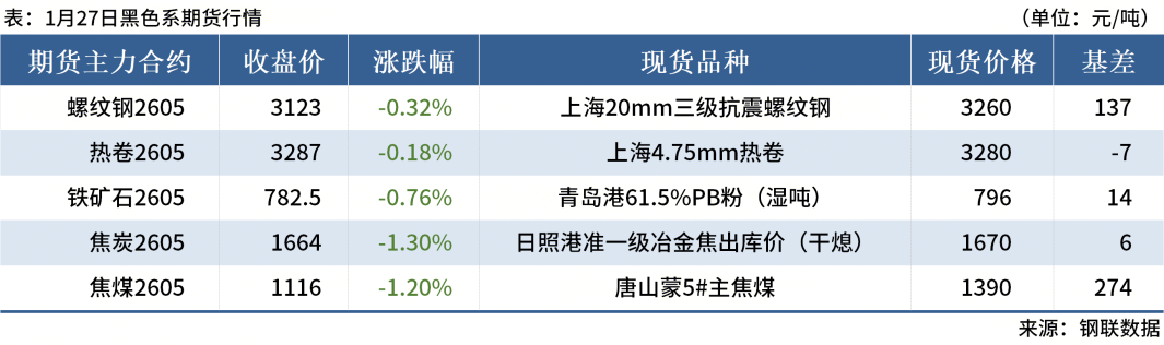 ◎1月27日,全国主港铁矿石成交80.95万吨,环比减23.2%;237家主流贸易商建筑钢材成交6.63万吨,环比减12.8%。