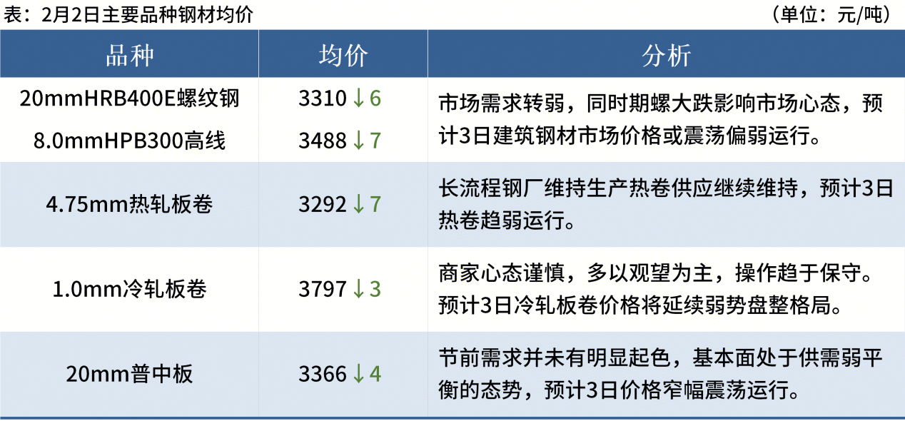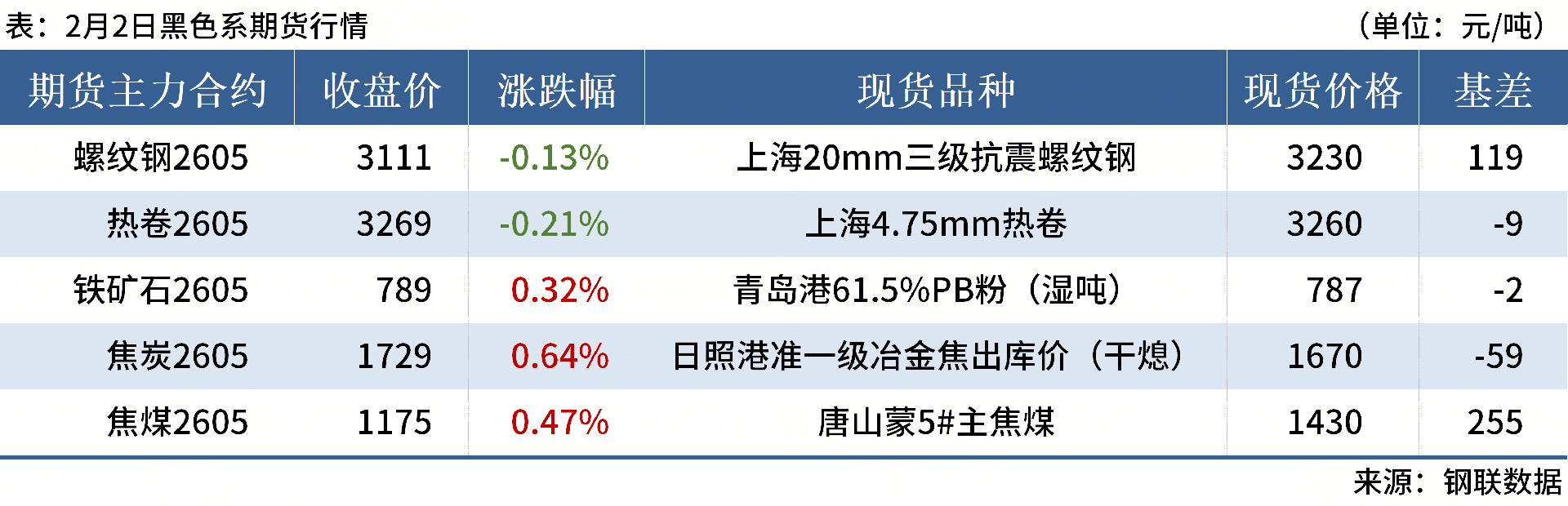 ◎ 2月2日,全国主港铁矿石成交81.70万吨,环比减9.9%;237家主流贸易商建筑钢材成交4.68万吨,环比减16.5%。