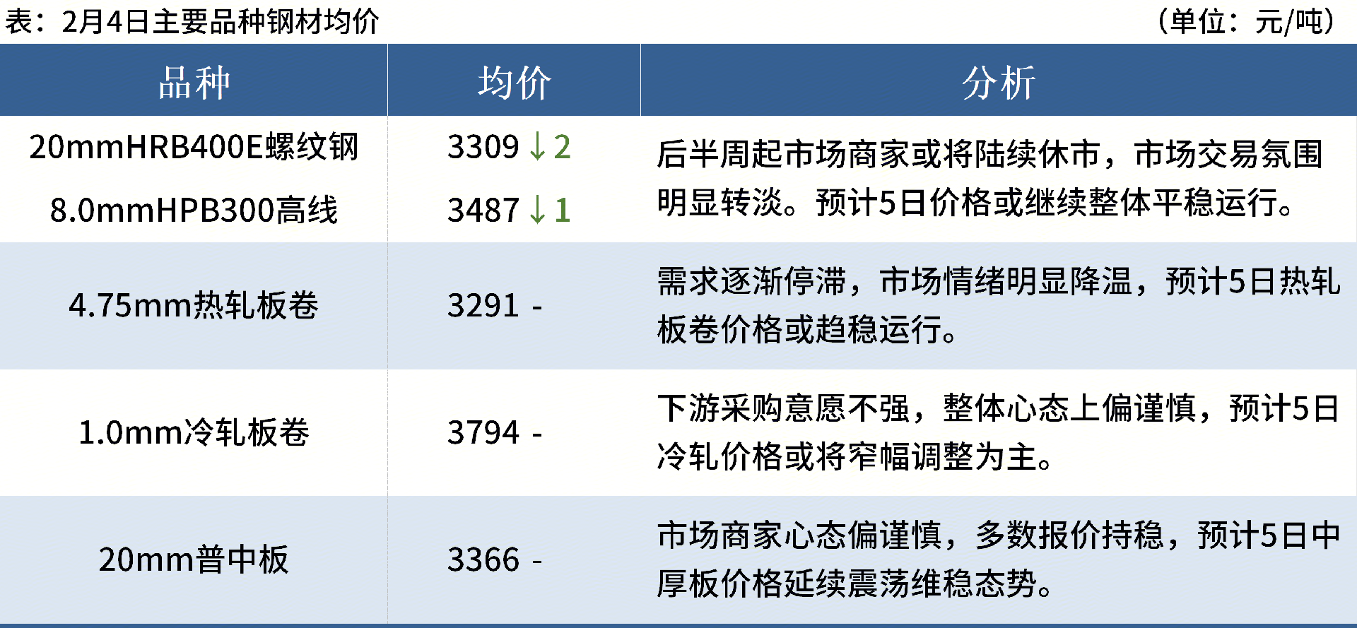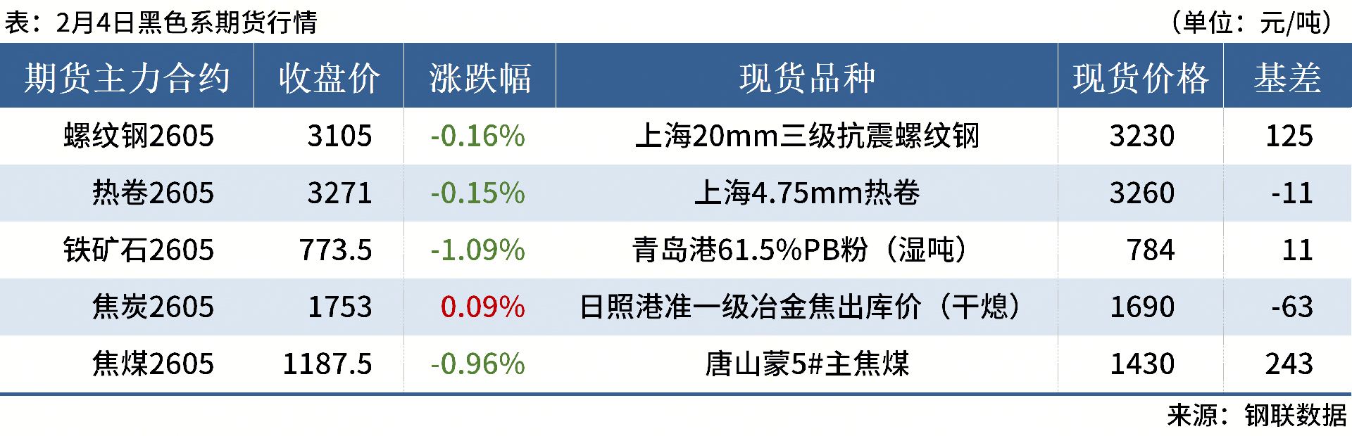 ◎ 2月4日,全国主港铁矿石成交103.40万吨,环比增14%;237家主流贸易商建筑钢材成交3.61万吨,环比减12.6%。