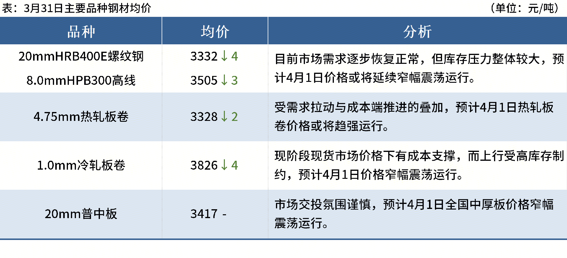 ◎3月31日,中天钢铁出台4月上旬价格,螺纹钢平,线材盘螺平。华东螺纹钢3400元/吨,线材盘螺3700元/吨。