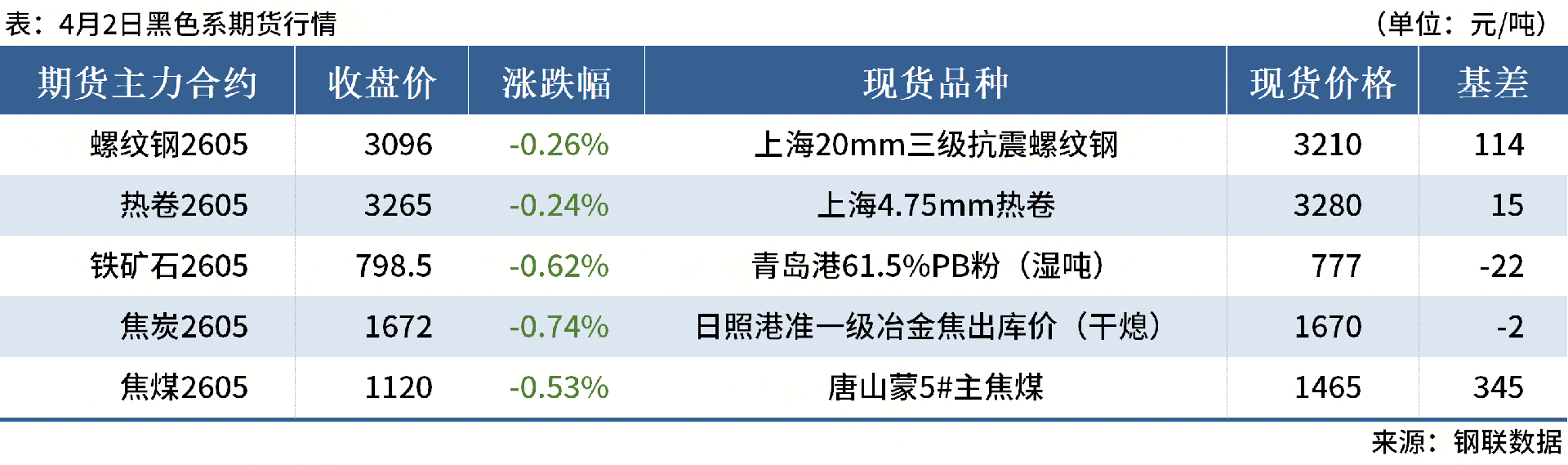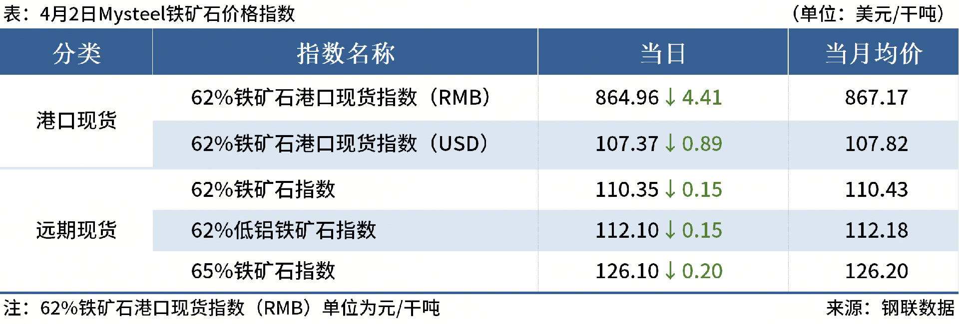 ◎4月2日,全国主港铁矿石成交102.10万吨,环比减0.3%;237家主流贸易商建筑钢材成交9.62万吨,环比减9.5%。