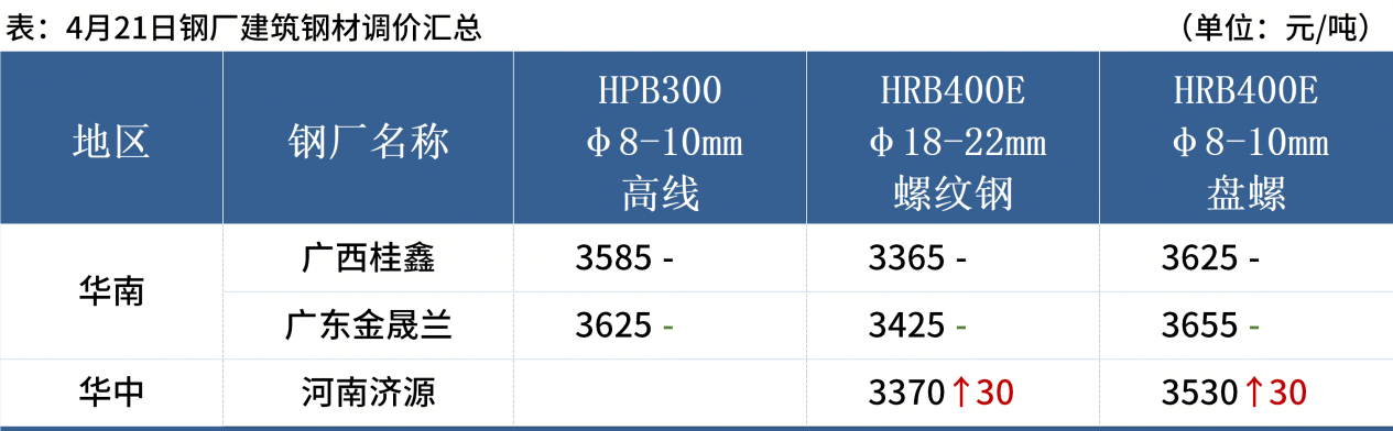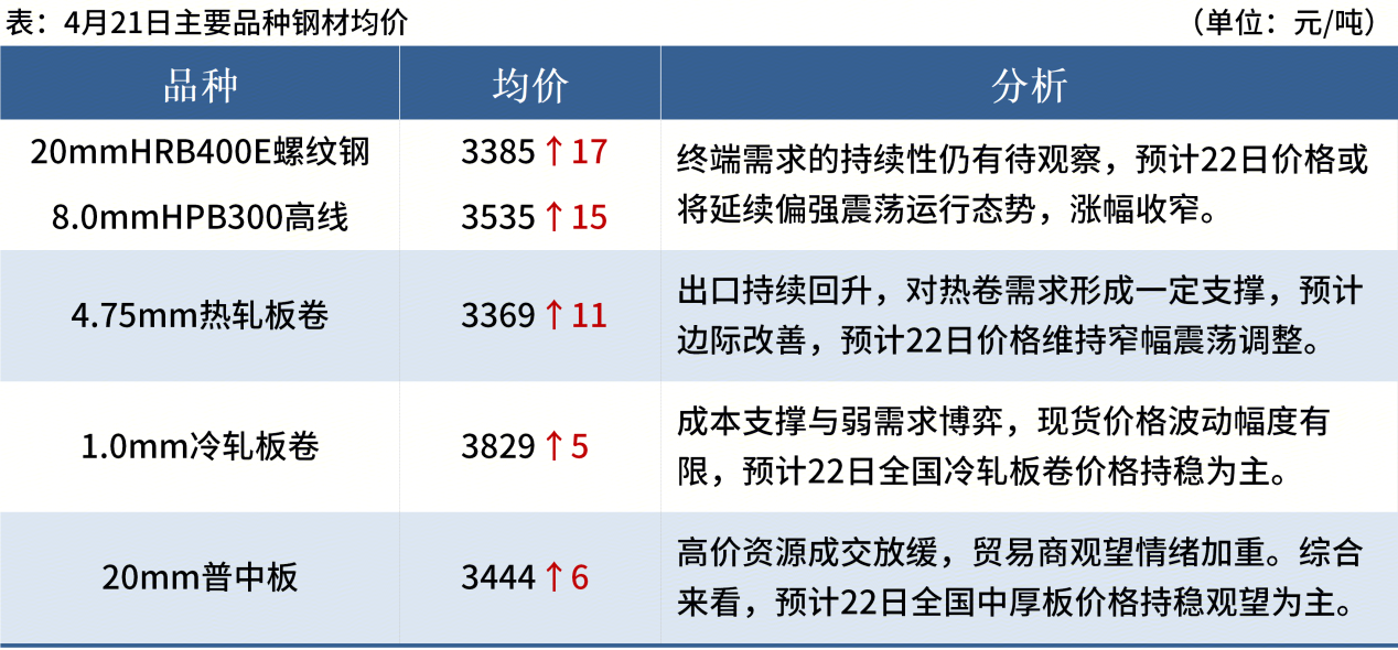 ◎ 4月21日,唐山迁安普方坯资源出厂含税上调20,报3020元/吨。