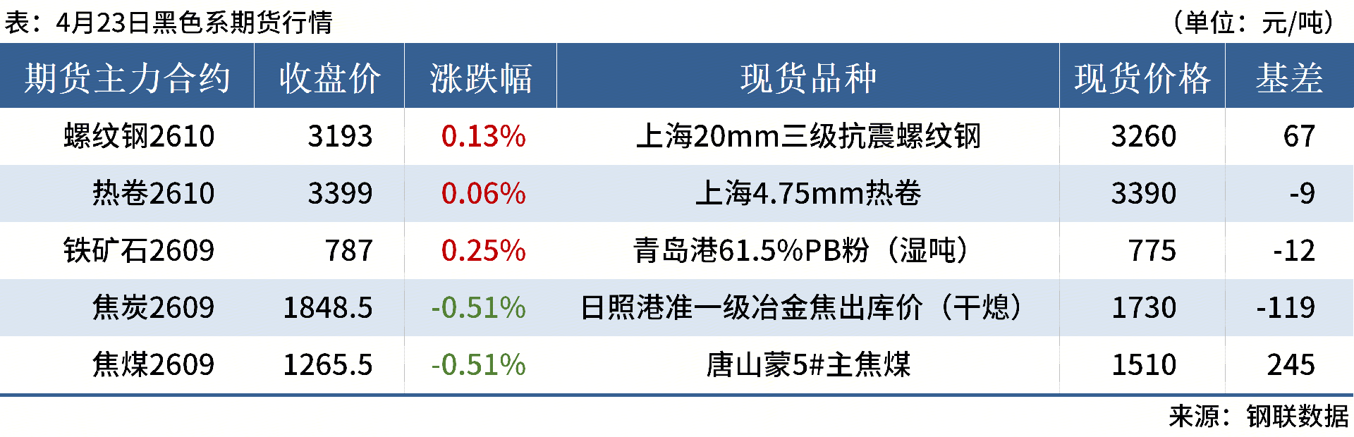 ◎ 4月23日,全国主港铁矿石成交101.90万吨,环比增78.8%;237家主流贸易商建筑钢材成交9.25万吨,环比减18.7%。
